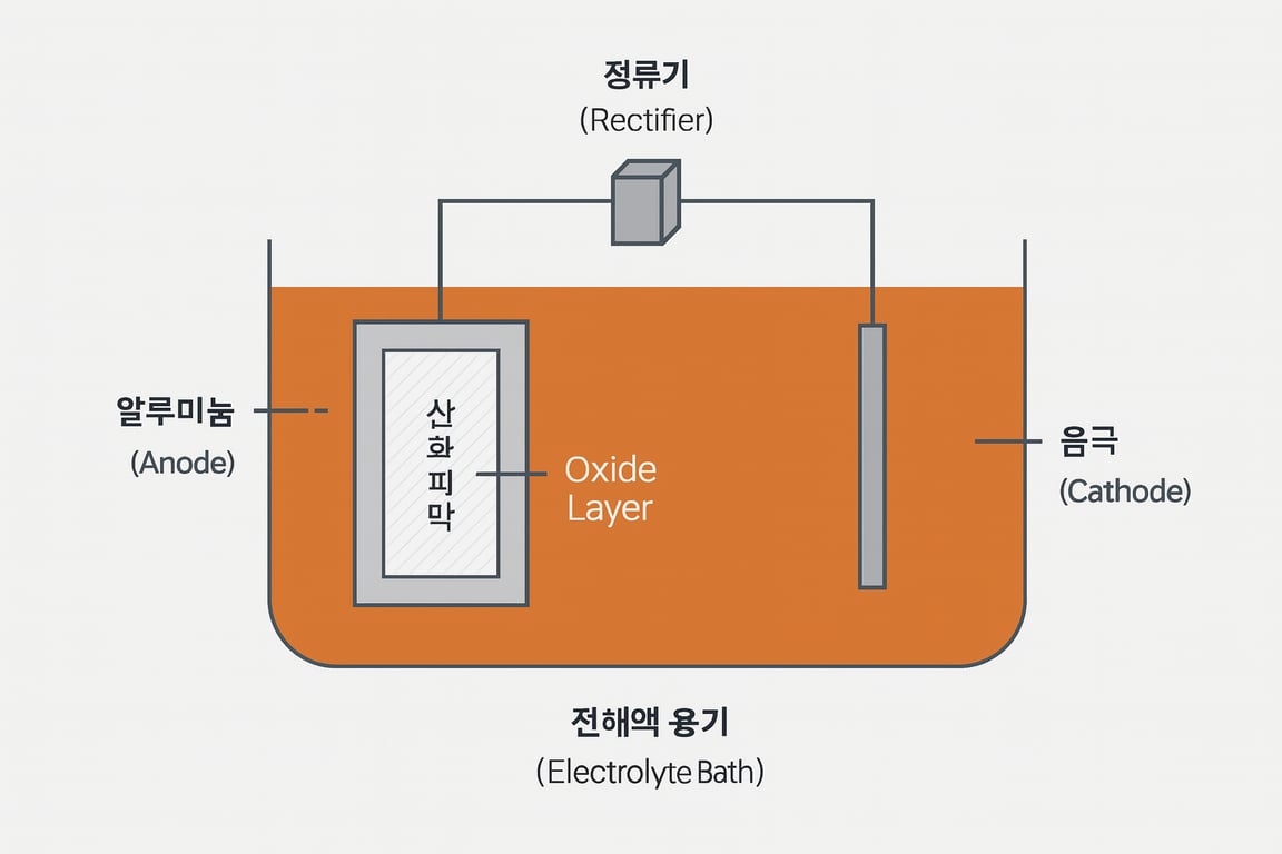 알루미늄을 양극(Anode)으로, 납이나 탄소 같은 불활성 전극을 음극(Cathode)으로 연결한 뒤, 황산(H₂SO₄) 전해액 속에서 직류 전류를 흘리면 표면에서 산소 이온(O²⁻)이 발생합니다.