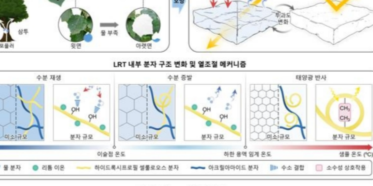 KAIST와 서울대 공동 연구팀이 포플러 나무의 열조절 전략을 모사한 ‘유연 하이드로겔 기반 열조절기(LRT)’를 개발했습니다. 이 소재는 수분 증발·응축에 따른 잠열 제어와 빛 반사·투과 조절을 하나의 장치에서 구현해 전기 없이도 실내 온도를 여름엔 3.7도 낮추고 겨울엔 3.5도 높일 수 있는 혁신 기술로 주목받고 있습니다. 건물 외장재, 야외 시설 등 에너지 공급이 어려운 환경에 적합한 차세대 패시브 열관리 기술로 기대됩니다.