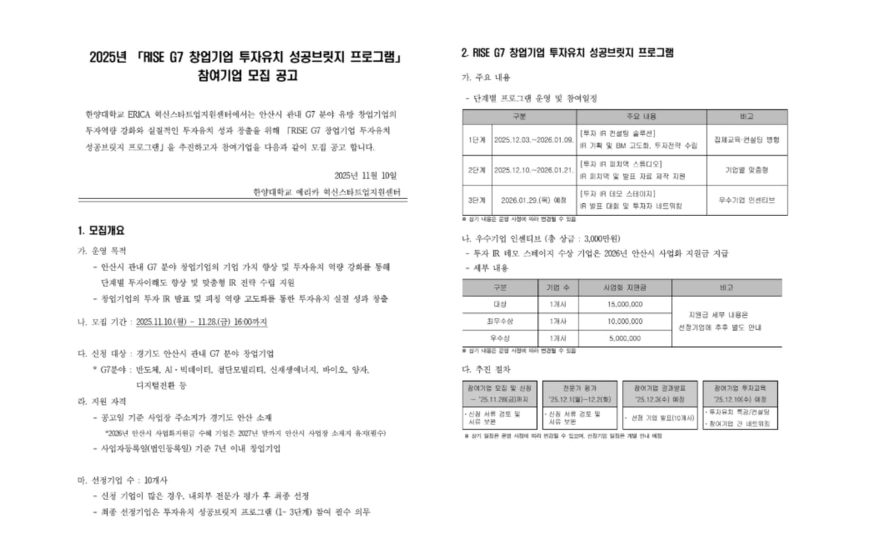 한양대 ERICA 혁신스타트업지원센터에서 안산시 G7 분야 창업기업(창업 7년 미만)을 대상으로 『RISE G7 투자유치 성공브릿지』 참여기업을 모집합니다. 접수는 11월 28일 16시까지 이메일로 진행되며, 선정기업 3곳에는 총 3,000만 원 규모의 사업화지원금이 지급됩니다.