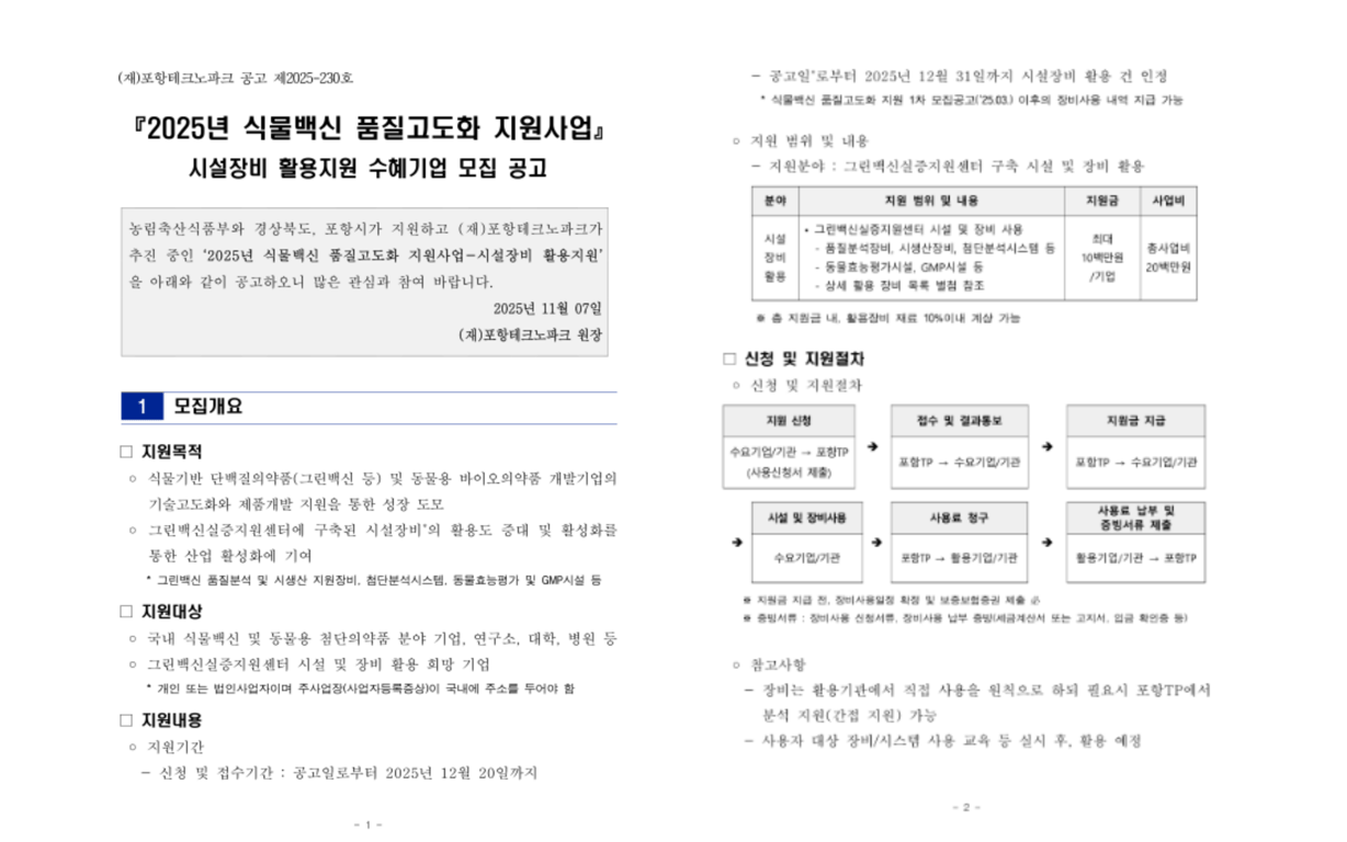 포항테크노파크에서 2025년 『식물백신 품질고도화 지원사업』의 일환으로 시설장비 활용을 희망하는 국내 기업을 모집합니다.그린백신실증지원센터의 장비 사용 시 기업당 최대 1,000만 원까지 지원되며, 접수는 12월 20일까지 이메일로 진행됩니다.