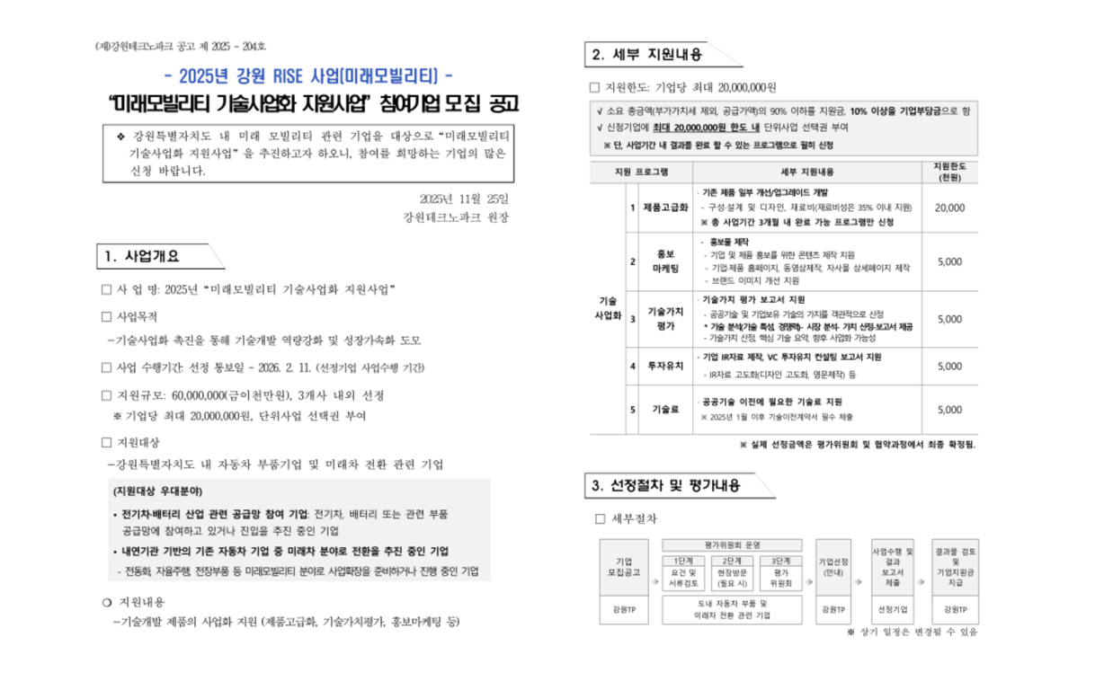 [강원] 2025년 미래모빌리티 기술사업화 지원사업 참여기업 모집 공고(RISE 사업(미래모빌리티)) (~12/08)