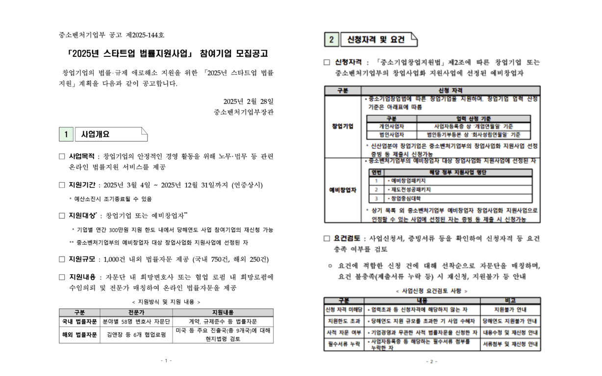 중소벤처기업부에서 창업기업의 법률·규제 애로 해소를 위해 ‘2025년 스타트업 법률지원’ 참여기업을 모집합니다. 신청기간은 2025년 2월 28일부터 12월 31일까지이며, 창업기업 및 예비창업자가 대상입니다. 국내외 법률자문을 온라인으로 제공하며, 연간 최대 300만원까지 수임료를 지원하니 많은 관심 부탁드립니다.