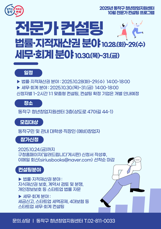 동작구 청년창업지원센터에서 10월 법률·세무 분야 1:1 맞춤형 전문가 무료 컨설팅 프로그램을 운영합니다. 동작구민 및 관내 (예비)창업자라면 누구나 참여 가능하며, 접수는 10월 24일까지 이메일로 가능합니다. 선착순 마감이므로 관심 있으신 분들은 빠르게 신청해주세요!